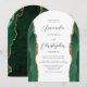 Die Seitenränder dieser eleganten modernen bogenförmigen Hochzeitseinladung weisen smaragdgrüne Wasserfarbe-Achat-Grenzen auf, die mit falschem Goldglitter besetzt sind. Der anpassbare Text kombiniert kohlegraue Script- und sans serif-Schriftarten auf weißem Hintergrund. Die Rückseite zeigt ein passendes smaragdgrünes und goldenes Achat-Design.