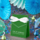 Eine elegante Smaragdgrüne Schachtel mit raffinierter weißer Schrift, die lautet: „BOX OF HAPPINESS FOR HER MAJESTY OF JOY.“