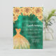 Eine moderne, stilvolle und glamouröse Einladung zu einer Quinceañera, 15. Geburtstagsfeier. Ein gestuftes smaragdgrünes Hintergrund mit einem goldenen Imitat ein Kleid und Rose, Blumensträuße. Der Name ist mit einem modernen handgeschriebenen Stilskript geschrieben. Personalisieren Sie Ihre Party-Daten und fügen Sie sie hinzu.