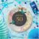 Eine Geburtstagszeitung - fabelhaft 50 mit personalisiertem Namen. Entworfen mit eleganten grünen Schmetterlingen. Ein schwarzer, kreisförmiger Rahmen in der Mitte überlagert ein Vintages Collage-Muster mit farbigen rosa Rosen und grünen goldenen Blätter mit einem schillernden, altmodischen Look.