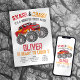 Diese lustige Party Einladung ist perfekt für die Monster Truck Geburtstagsparty Ihres Kindes.