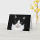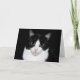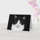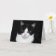 Schwarzweiss-Smokings-Miezekatzekatze auf einer schwarzen Hintergrundgrußkarte