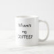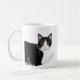 Schwarzweiss-- oder Tuxedokatze will, um zu wissen, wo sein Kaffee Foto-Tasse ist. Text kann mit dem BESONDERS ANFERTIGEN KNOPF geändert werden oder entfernt werden.