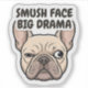 Quirky vector tan French Bulldog rocks the ultimate skeptical side-eye—half-squint, half-stare, wrinkles galore—topped by cloud-shaped "SMUSH FACE BIG DRAMA." Dog moms, customize this die-cut sticker for mugs, laptops, or totes celebrating your theatrical snorter.
