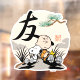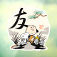 Karo in dieser bezaubernden japanischen Motivgrafik von Snoopy, Charlie Brown und Woodstock, die sich im Abend entspannen. Mit dem Symbol für "Freund" und einer roten Briefmarke, die "Snoopy" lautet.