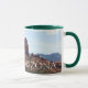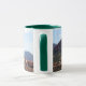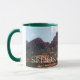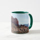 Weiß und Jäger grün 11 oz. Combo-Tasse mit einem Aquarellbild einer vorherrschenden und erkennbaren roten Felsformation, nah zur Stadt Sedona am Fuße der Crimson Cliffs.