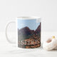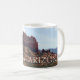Weiß und Jäger grün 11 oz. Combo-Tasse mit einem Aquarellbild einer vorherrschenden und erkennbaren roten Felsformation, nah zur Stadt Sedona am Fuße der Crimson Cliffs.