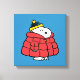 This vibrant canvas art print features a large-scale graphic of the beloved Snoopy character dressed warmly for the cold. Snoopy is prominently displayed wearing a large, puffy red winter coat and a blue and yellow knit cap, set against a striking, solid blue background that fills the entire square frame. This canvas is a bold and cheerful piece of wall décor, perfect for adding Peanuts charm to a bedroom, office, or any space during the winter and holiday season.