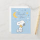 Senden Sie Ihren Gästen und Geschenkgebern herzlichen Dank mit dieser niedlichen Peanuts-Snoopy-und-Woodstock-Dankeskarte. Die Vorderseite zeigt die herzliche Illustration von Snoopy, der Woodstock unter einem hellen Mond und funkelnden Sternen umarmt, vor einem beruhigenden hellblauen Hintergrund mit einer Schrift, die "Danke" lautet. Die Rückseite der Karte ist vollständig angepasst und enthält eine besondere Nachricht über die Ankunft des Babys und die Namen der Eltern, was eine charmante, nostalgische und persönliche Möglichkeit bietet, Ihre Wertschätzung nach Ihrer geschlechtsneutralen oder Baby-Jungen-Babyparty auszudrücken.