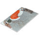 Art Deco vintage illustration of a woman wearing a red fur lined winter coat and hat, standing in the blowing snow with a cluster of snow buntings flying in front of her. Magazine cover illustration by Will Hammell (1914).