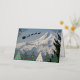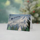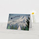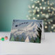 Seasonal holiday card that features a scenic, landscape photo image of snow covered Mount Hood with colorful Christmas tree symbols and a Santa Claus sleigh with reindeer silhouette, along with Season's Greetings in silver foil printing.