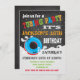 Super fun Snow Tubing Geburtstagsparty mit fallendem Schnee, einem großen blauen Schlauch und lustigen Schriftart auf einem Chalkboard Hintergrund. Ideal für ein Mädchen oder einen Jungen. Handgezeichnete Abbildung von McBooboo.