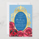 Diese Party Einladung zeigt ein Snow White Märchenthema auf hellblauem Hintergrund. In der Mitte befindet sich ein Bild eines Goldspiegels mit den Veranstaltungs- und Veranstaltungsinformationen. Rote Rosen und ein roter Giftapfel akzentuieren den unteren Teil.