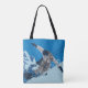 Snowboard, Mountain, Extremsport mit Blau und Weiß die dominierenden Farben mit nur einem Hauch von Orange. Eine kühne Winterlandschaft mit Schnee, Bergen und Kiefern. Die Szene ist als Rückblick auf die Druckerei aus der 70er-Zeit konzipiert. Zwei Snowboarder-Bilder, eine auf jeder Seite, auf einem überall bedruckten Totbeutel. Das Monogramm ist vollständig anpassbar und kann auf alles geändert werden, was man möchte oder zusammen eliminiert. Diese Taschen sind geräumig und stabil. Sie können als robuste Tasche oder nur für Lebensmittel arbeiten. Sie können es in die Berge nehmen einen Urlaub oder nutzen Sie es jeden Tag als Fang alle Tasche.