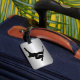 Gepäckanhänger mit Snowboarder-Bild. Silber graue Farbe mit Snowboarddesign auf beiden Seiten. Anpassen mit schwarz gedrucktem Text auf einer Seite, mit Namen und / oder Kontaktinformationen. Maskuline Schwarz und Grau arbeitet für einen Teenager oder Mann.