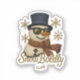 A cute glittery snowman with a black top hat, amber scarf, and sunglasses, framed by gold snowflakes. Ideal for winter apparel, kids’ outfits, and festive gifts.