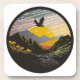 A sticker with an eagle flying over a mountain, in the style of contemporary landscape, golden light, black mountain college, fisheye lens, arts and crafts movement, mid-century illustration