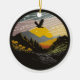 A sticker with an eagle flying over a mountain, in the style of contemporary landscape, golden light, black mountain college, fisheye lens, arts and crafts movement, mid-century illustration