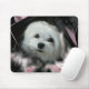 Die niedliche Mausunterlage kennzeichnet Snowdrop, einen süßen kleinen maltesischen Hund. Ihr Porträt wird innerhalb einer künstlerischen Schaffung der rosa Blumen und schwarzen der Spitzes enthalten, die dem Bild eine ungewöhnliche und drastische Wirksamkeit verleiht.