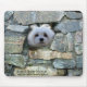 Diese Mausunterlage kennzeichnet Snowdrop, ein süßes wenig maltesisches Lugen durch eine Steinwand.