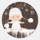 Schneeflocken Babyduschkleber mit einem niedlichen weißen Schneeoutfit und Hut auf rustikalem Schneeflockhintergrund. Sie können Text hinzufügen, um diese niedlichen Baby Duschkleber für den Winter zu personalisieren.