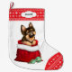Ein bezaubernder, kleiner Welpen-Pop aus einem roten Geschenksack vor diesem Weihnachtsmann-Strumpf. Ein paar aquamarine und goldene Holiday Baum Glühbirnen liegen direkt vor der Santa-Tasche Das Bild wird auf einem weißen Hintergrund platziert, und die Zehen und obere Grenze sind ein rot-weißes Schneeflockenmuster. An der oberen Grenze befindet sich ein weißes Etikett mit dem eigenen Text in dunkelgrau. Die Rückseite des Strumpfs weist das gleiche rote und weiße Schneeflockenmuster auf.