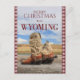 Auf dieser Postkarte finden Sie ein spektakuläres Western-Foto mit abgenutzten Cowboystiefeln, die mit einem maßgeschneiderten mexikanischen Peso-Sporn ausgestattet sind. Roter Text oben steht für "Frohe Weihnachten aus Wyoming", wobei der WYOMING aus einem roten und schwarzen Büffel kariert gemacht wird. Die Stiefel stehen auf Holz vor einem blauen, wolkigen Western-Himmel. Ein rot-weißer Schneeflockenrand macht die Karte festlicher.