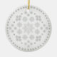 Fügen Sie Ihrem Weihnachtsbaum eine elegante Touch mit diesem atemberaubenden Keramik-Ornament hinzu. Dieser perfekt rund und mit einem faszinierenden Schneeflockendesign geschmückte Schmuck zeigt konzentrische Kreise von fein detaillierten Schneeflocken. Die zentrale Schneeflocke beherrscht Aufmerksamkeit mit ihrem kühnen und symmetrischen Design, während die kleineren um sie herum einen harmonischen, winterlichen Effekt erzeugen. Mit Sorgfalt gefertigt, zeichnet sich das gleiche exquisite Muster von beiden Seiten aus und garantiert Schönheit aus jedem Winkel. Eine zarte goldene Saite rundet das Aussehen ab und verleiht dem Baum einen Hauch von Eleganz, da er mühelos auf dem Baum hängt. Dieses zeitlose Stück wird sicher ein gepflegter Bestandteil Ihrer Urlaubsstimmung werden!