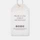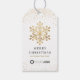Personalisierte Weihnachtsgeschenke-Tags mit dekorativen Imitaten goldenen Schneeflocken und schneebedeckten Glitzer mit Firmenlogo und weiteren Informationen auf der Rückseite, modern und trendig.