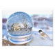 Im Inneren einer Schneekugel liegt eine Winterlandschaft mit einer Hütte, die von nackten Ahorn- und Kirschbäumen überschattet wird. Schneeflocken auf dem Rasen, heilige Sträucher mit leuchtend roten Beeren flankieren die Tür und Schneeflocken stürzen durch die gefrorene Luft. Neben dem Globus sieht ein kleines Jägerchen in der Miniaturszene merkwürdig aus.