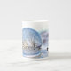 Im Inneren einer Schneekugel liegt eine Winterlandschaft mit einer Hütte, die von nackten Ahorn- und Kirschbäumen überschattet wird. Schneeflocken auf dem Rasen, heilige Sträucher mit leuchtend roten Beeren flankieren die Tür und Schneeflocken stürzen durch die gefrorene Luft. Neben dem Globus sieht ein kleines Jägerchen in der Miniaturszene merkwürdig aus.