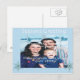 Diese Snowflake Holiday Postkarte kann leicht personalisiert werden, indem Sie mit der benutzerdefinierten Textvorlage Ihr eigenes Foto zur Vorderseite hinzufügen. Die Grußkarte bietet einen hellen, schneeblauen Hintergrund mit blauen glitzernden Schneeflocken.