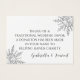 Üben Sie eine Hochzeitsfreundlichkeit, wenn Sie eine Spendenkarte für Ihren Empfang in den Monaten Dezember, Januar oder Februar arrangieren. Die elegante Snowflake Winter Wedding Wohltätigkeit Gunst Card Staaten, die anstelle eines traditionellen Gastgeschenks, eine Spende in ihrem Namen für die Wohltätigkeit gemacht wurde. Passen Sie die Karte an, indem Sie den Namen der bevorzugten Wohltätigkeit und die persönlichen Namen der Braut und des Bräutigams angeben. Diese elegante wintery Hochzeitskarte mit Wohltätigkeit-Gaumenkarten ist mit silbergrauen Schneeflocken geschmückt, die die Ecken mit weißem Hintergrund schmücken.