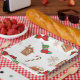 Festliche Weihnachtsabend-Teller mit Schneeflocken, Bonbons, Lebkuchenhäusern, Bogen und Weihnachtsfeiern.