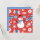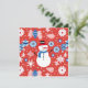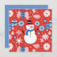 Ein niedlicher Schneemann mit einem roten und schwarzen Hut und einem hellblauen Schal auf rotem Hintergrund mit Schneeflocken.