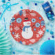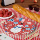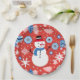 Ein niedlicher Schneemann mit einem roten und schwarzen Hut und einem hellblauen Schal auf rotem Hintergrund mit Schneeflocken.