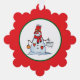 red scalloped ornament featuring a snowman with red hearts, holding an orange bauble and snowy branch, hanging on a festive christmas tree
