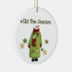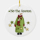 Ein Schneemann mit einem grünen, langen Kleid und rotem Streifen Schal und Text, der "Das ist die Jahreszeit" auf einem Halb-Sake-Urlaubsornament.