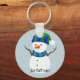 Snowman Design Schlüsselanhänger mit einem niedlichen Schneemann auf blauem Schneeuntergrund und anpassbarem Text.