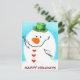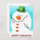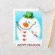 Niedlicher Schneemann mit grünem Hut. Text auf der Karte: Glückliche Feiertage
