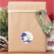 Ein großartiger Anhänger für Ihre Geschenke. Ein niedlicher Schneemann mit einer großen Karottennase und einem kleinen rosa Herz auf der Wange. Blauer Hut, Schal und Ohrmuffel. Kleine Schneeflocken im Hintergrund. Passen Sie Ihre Wünsche an.