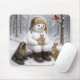 A charming snowman perched on a snowy log, surrounded by delightful woodland creatures in a picturesque winter forest