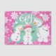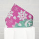 Holiday Tissue Paper mit whimsical, farbenfroh Design mit einem heißen Rosa mit weißem Schneeflocken Hintergrund, einem Kreis aus Aqua-Blau mit kleinen weißen Polka Punkte, und drei bezaubernde Schneemänner mit rosa und blauen Winterhüten und Schals und weißem Text, der Joy liest!