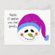 Ein niedlicher Schneemann mit einem lila Hut mit Schneeflockakzenten. Ein großes Grinsen und eine grüne Karottennase ergänzen ihn. Das Sprichwort kann nach Wunsch geändert werden.