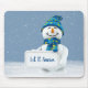 Ein niedlicher Schneemann in Schneeflocken mit einem weißen Schild im Schnee. Text kann bearbeitet werden.