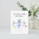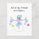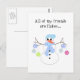 Ein niedlicher Schneemann mit Zweiarmen und farbenfrohen Schneeflocken, die an ihnen hängen.