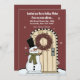 Ein wunderschönes, winterliches Design mit einem whimsical Schneemann in seinem Schal und Hut an der Haustür. Die Tür hat einen schönen Beerenbrand und ein leichter Schnee fällt.