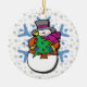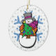 Dieses Weihnachtsschmuck zeigt einen Schneemann, der einen kleinen Weihnachtsbaum auf einem Schneeflockenhintergrund hält.
