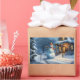Ein angenehmes, buntes Wintergemälde eines Schneemanns außerhalb eines Hauses.