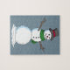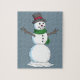 Ein fröhlich aber kühl aussehender Schneemann trägt in dieser winterlichen Illustration von Richard H. Fay einen rot gerippten Oberhut und grünen Schal.